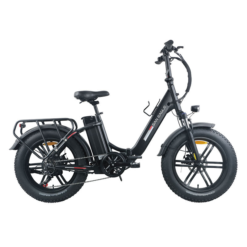 This battery is designed to be easily removed from the bike frame, allowing for convenient charging and storage. The battery has a sleek and embedded design, making it easy to carry with you on the go. It is also incredibly powerful, with a long-lasting charge that can provide up to 50 miles of riding distance. All ebikes batteries have undergone strict safety testing before packaging to ensure the safety of charging and using. Each bike frame is drawn creatively by SANEAGLE's team of designers and its step through design makes it easy to use for riders of all levels.